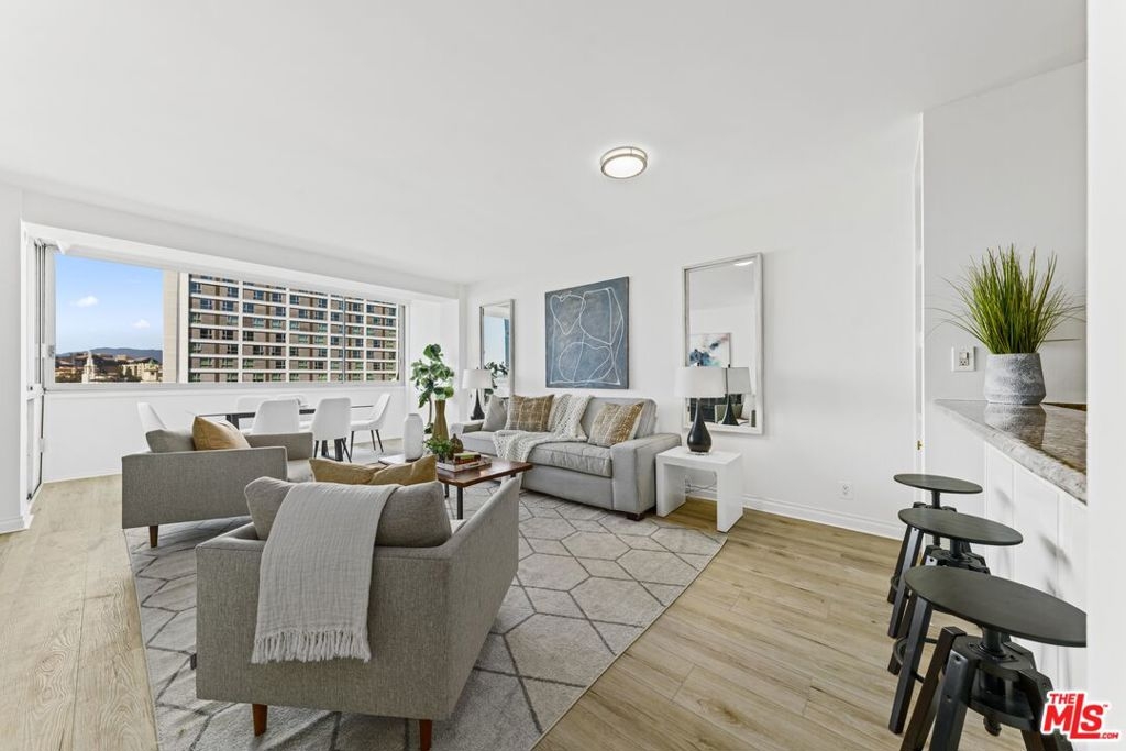 Large 1 bedroom, 1 bathroom condominium located in Park Westwood Towers, the premier luxury high-rise building in the heart of Westwood Village (only 1 block to UCLA). Features: open kitchen with stone counters, stainless appliances, and breakfast bar; large open-concept living room/dining area with wonderful views of Westwood Village; primary bedroom suite with updated bathroom; new laminate wood floors; new paint; new HVAV system; new lighting; high ceilings; and incredible natural light from huge windows with City views. This sought-after NY-style building offers valet guest parking, 24-hour doorman, beautiful lobby and public rooms, onsite manager, stunning heated pool/spa, and low HOA dues ($641/month) which include: building amenities, water/sewer/trash, basic cable, internet, community laundry (near free), earthquake insurance and 1 gated parking space. Located close to restaurants, shopping, movies, 'W' Hotel and Trader Joe's.